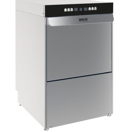 Undercounter dishwasher, 600 dishes/h, double-walled, deep drawn rails, atmospheric boiler, air-gap, thermostop, electronic control, rinse pump, rinse aid and detergent dispenser, drain pump.