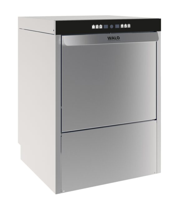 Lavavajillas bajo encimera, 600 platos/h, doble pared, cubeta moldeada, guías embutidas, brazos de lavado y de aclarado independientes en acero inoxidable, caldera atmosférica, air-gap, termostop, electrónica parametrizable, bomba de desagüe, bomba de aclarado, dosificador de abrillantador y detergente. Dotado de los sistemas de:
